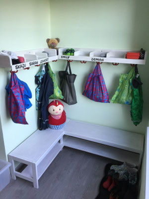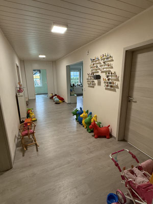 Hier sieht man das Herzstück der Wohnung, den großen Flur mit Garderobe, Fotowand, Wickeltisch und gaaaanz viel Platz zum toben.